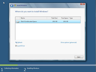 8. Disini kita dapat memilih pastisi yang ingin digunakan sebagai system, kita juda bisa untuk memformat, membuat partisi dll, buat partisi baru untuk system windowsnya. Setelah Anda mengkonfigurasi drive klik “Next”